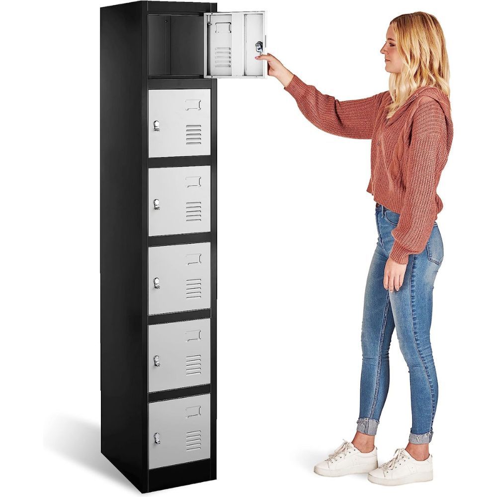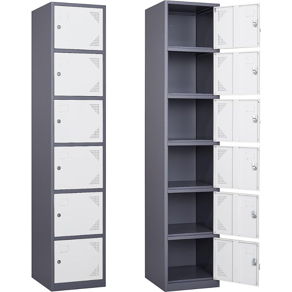 The Yizosh Metal Locker is the perfect solution for organizing your home or gym. It features six separate compartments, each with its own latch that is compatible with most combination locks or padlocks.