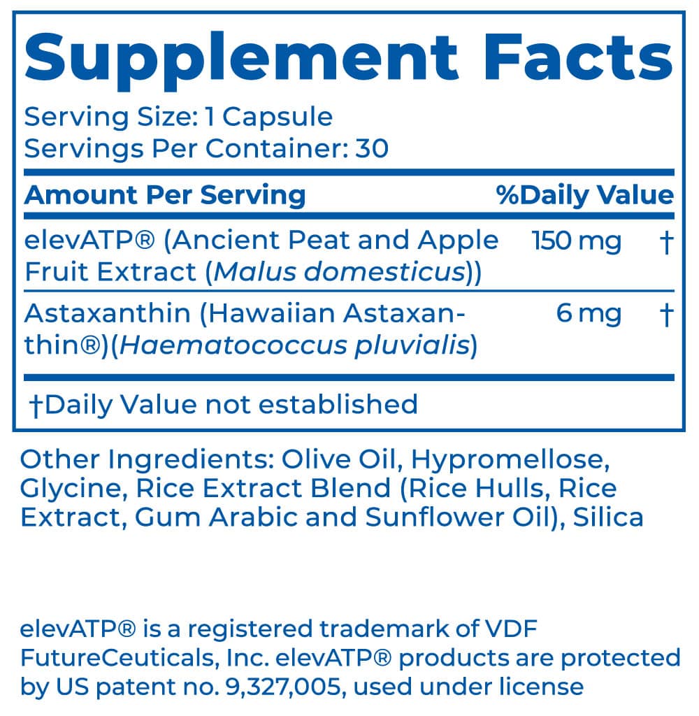 elevATP, made of natural peat and apple polyphenols, has been clinically studied to promote improved athletic performance and supports your body’s own production of ATP – the molecule used for energy.