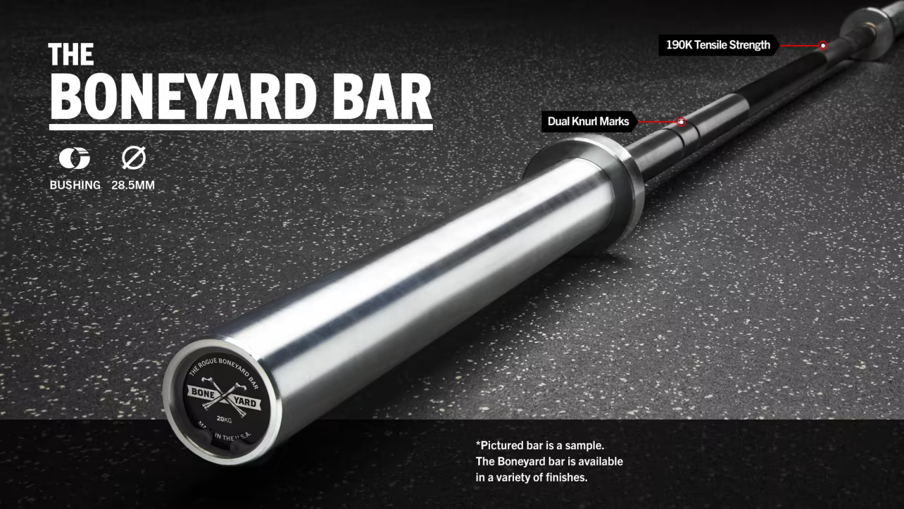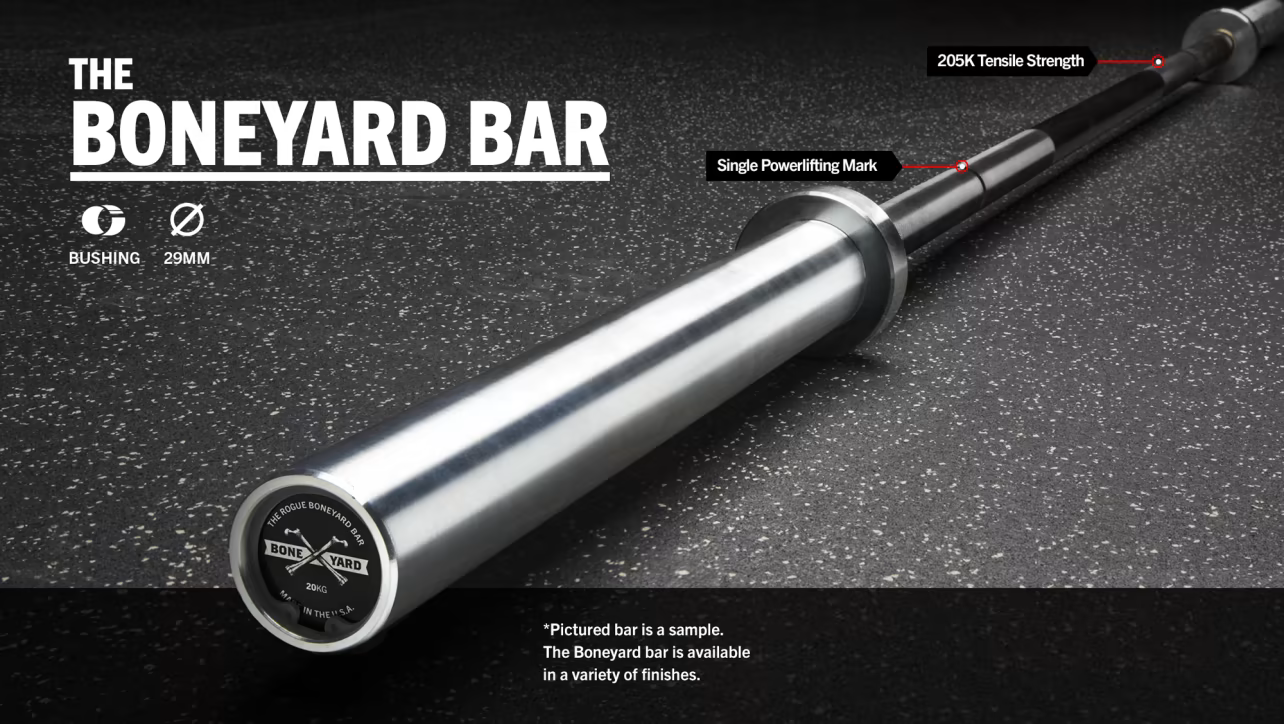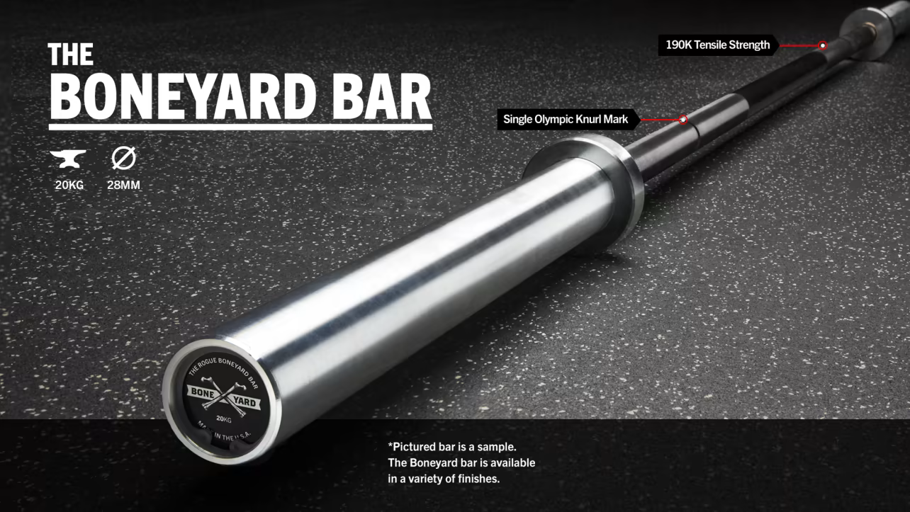 Rogue 29mm Boneyard Bar lineup is a great way to get quality equipment at a discounted price. The barbells are created with all new components, but with minor fit and finish flaws.