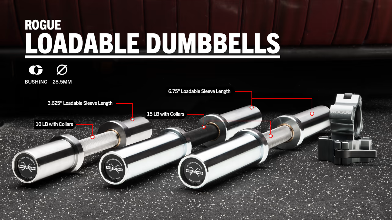 The Rogue Boneyard Dumbbells are quality seconds that have been created to still be used in a gym. These loadable dumbbells are all new components with a minor flaw in fit and finish, but are still of an excellent quality.